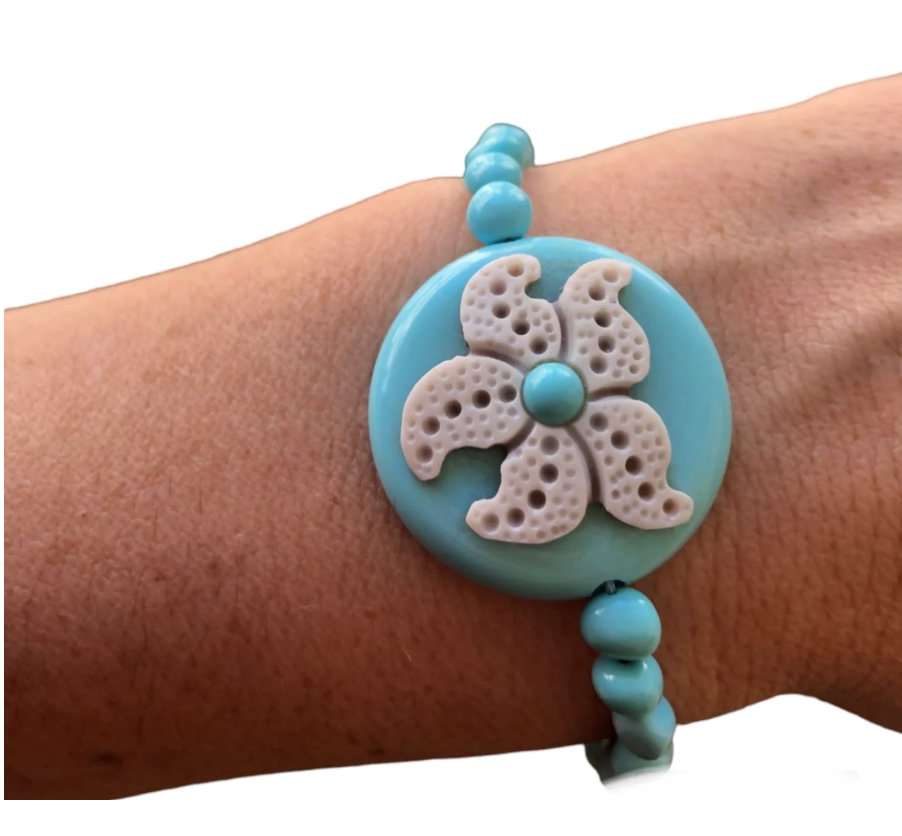 Elevate your beach-inspired style with this stunning turquoise paste bracelet featuring an Italian cameo intricately engraved with a starfish design. The 19 cm bracelet is crafted with high-quality turquoise paste beads ( 5mm ) and showcases a focal point of a beautifully detailed starfish cameo. The bracelet is completed with a secure 925 sterling silver closure, adding a touch of elegance to the piece. Embrace the beauty of the sea with this unique and eye-catching bracelet, perfect for adding a touch of coastal charm to any outfit. Ideal for those who appreciate artisanal craftsmanship and distinctive accessories. Treat yourself or a loved one to this exquisite piece that captures the essence of the ocean.
