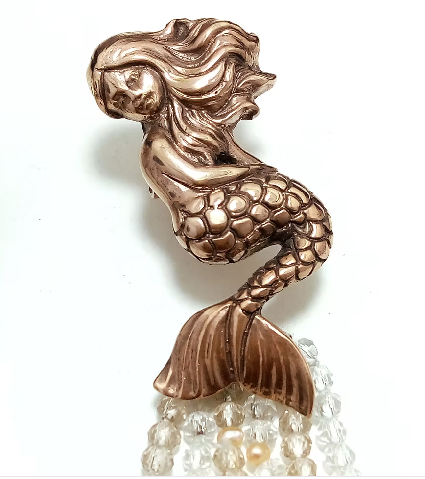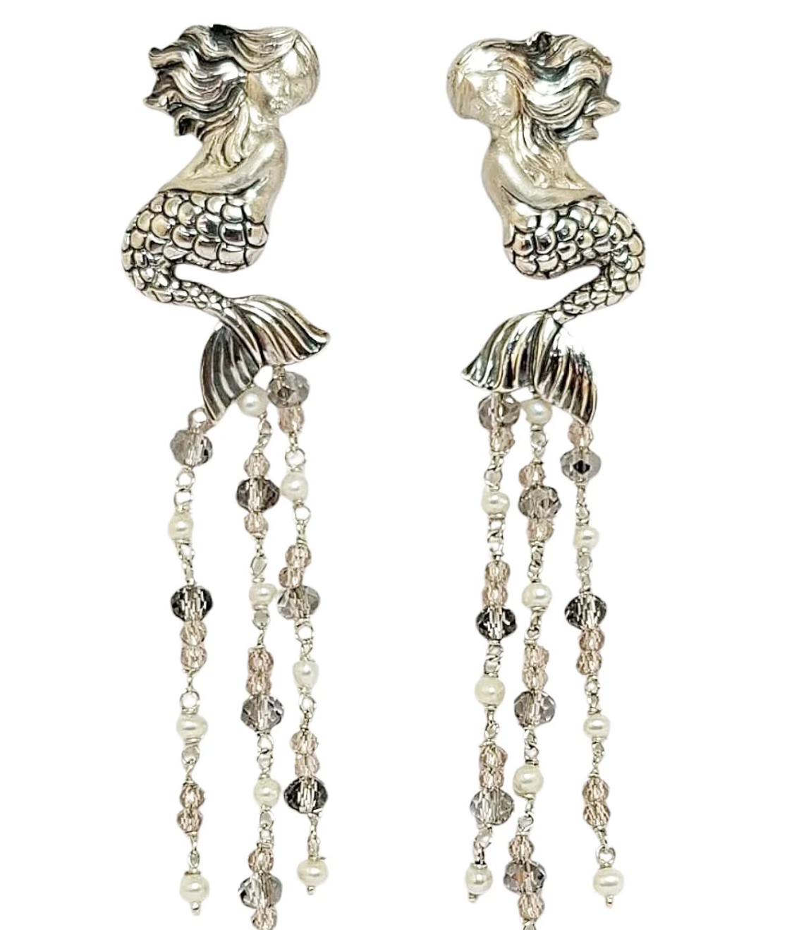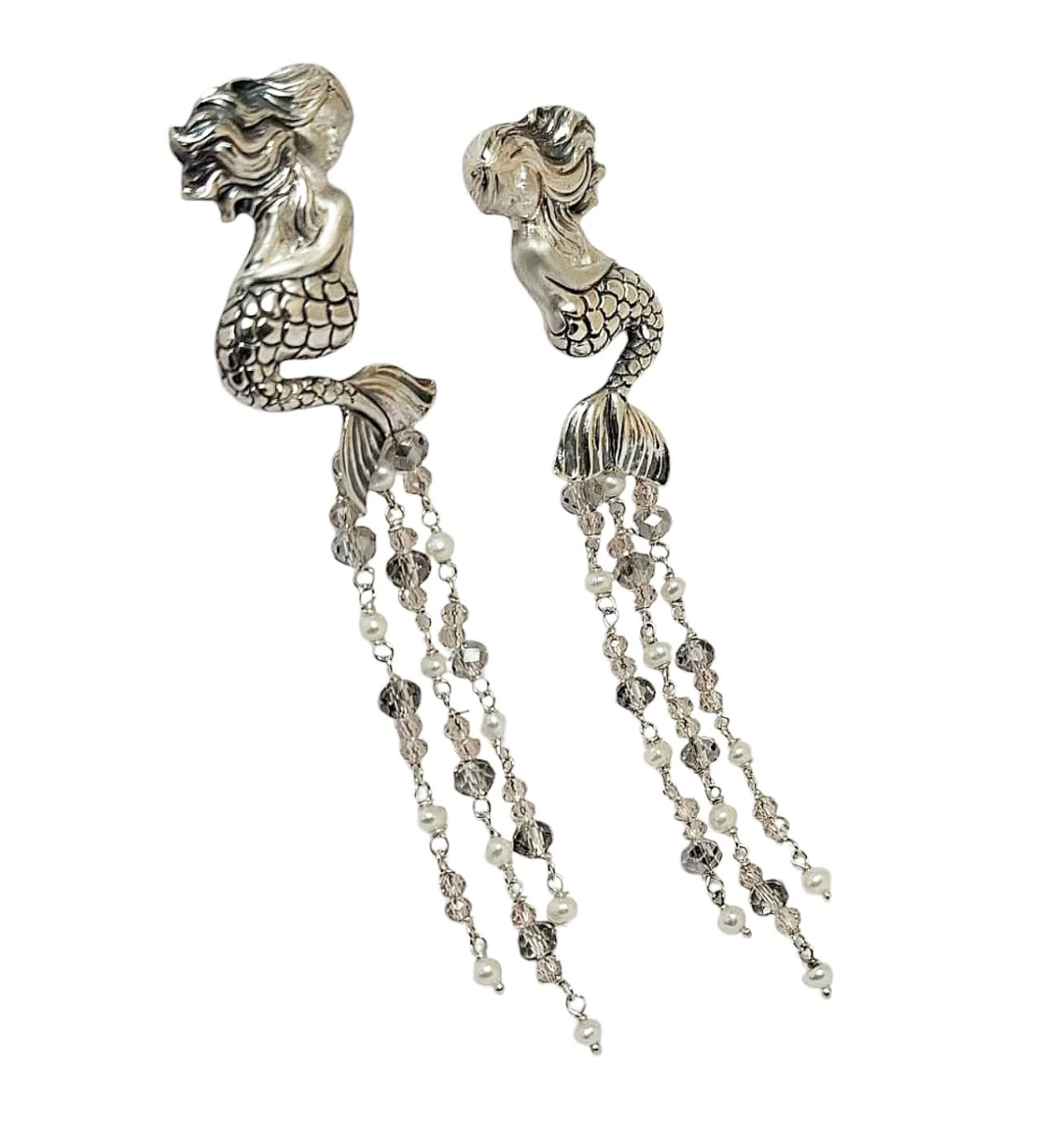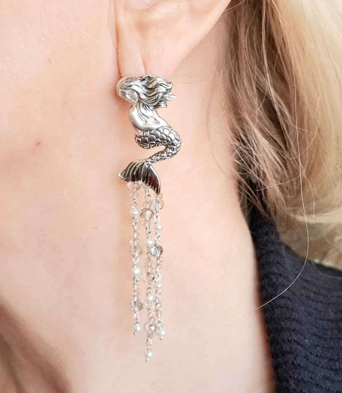 Design: Mermaid figures near the earlobes with dangling pearl and crystal accents