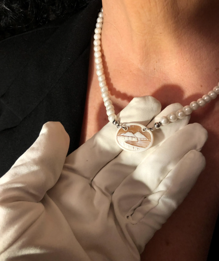 The cameo pendant depicts the landscape of the city of Naples, with Vesuvius.