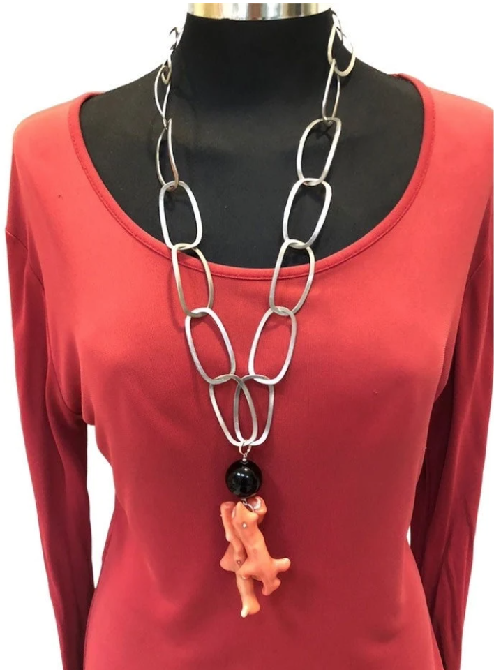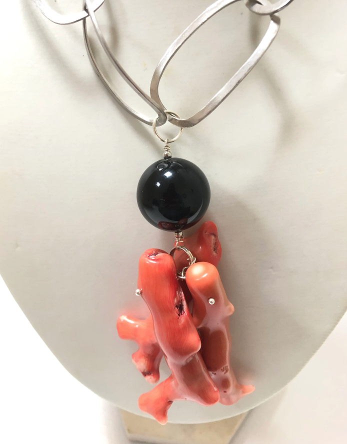 The pendant consists of three coral madrepores and a black onyx sphere.