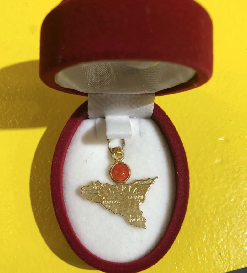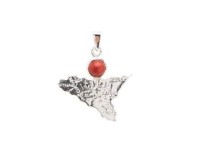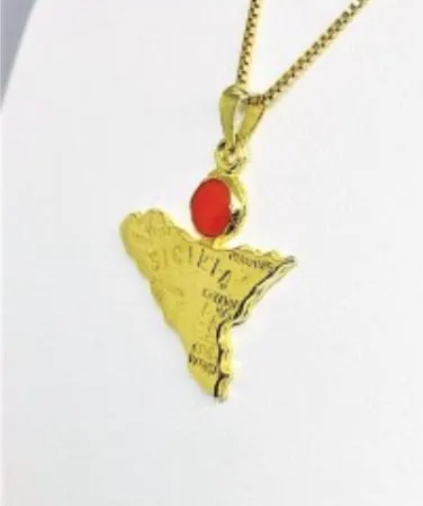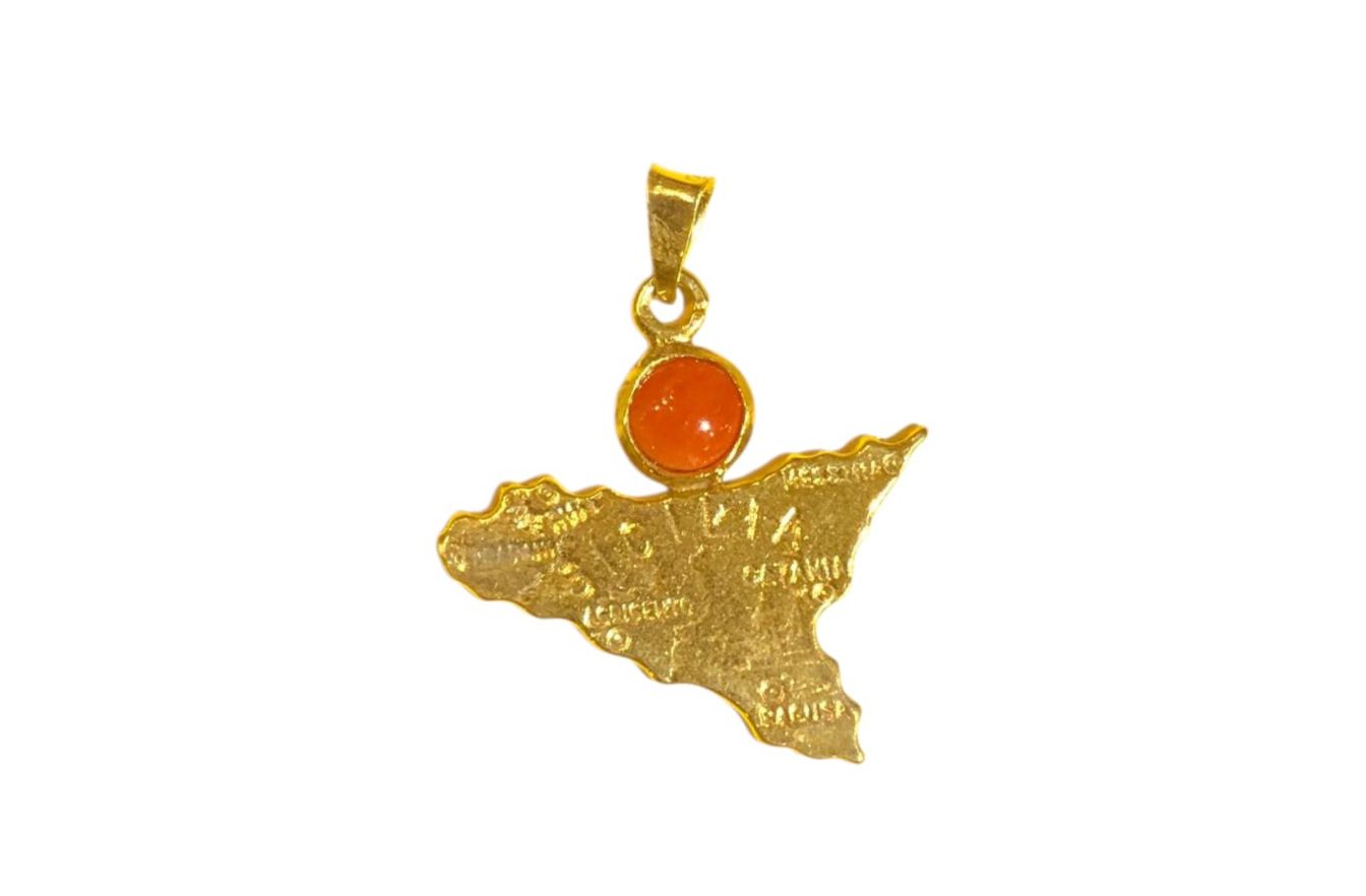 Gold-Plated Sicily Pendant in 925 Sterling Silver with Red Coral Bead ,Removable Clasp ,Optional Silver Chain